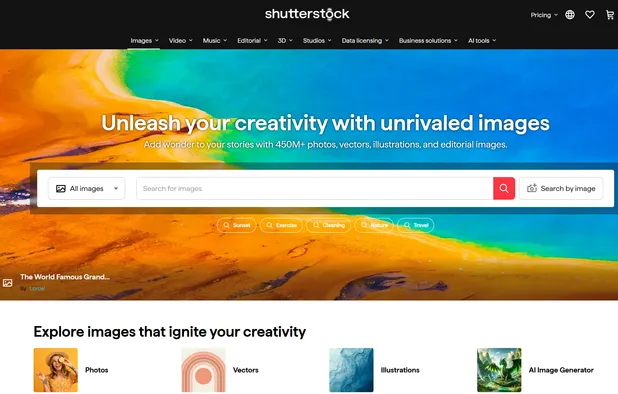 Access a large collection of royalty-free images, high-resolution videos, vector graphics, and audio assets for digital projects, plus an AI image generator.